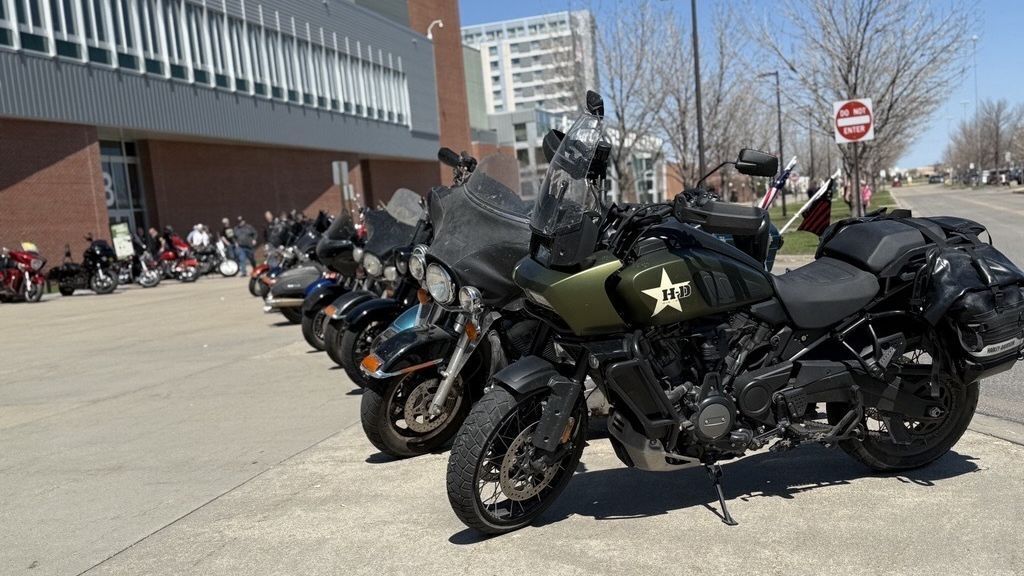 Motorcycles lined up outside the Alerus Center for the 2025 Spirit of America Bike & Car Show